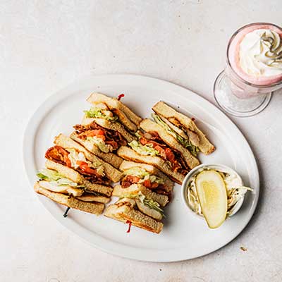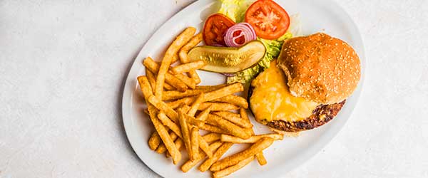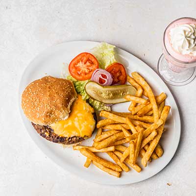 Char-broiled, lean ground beef burgers served on a sesame seed bun with tomatoes, onion, lettuce & dill pickle